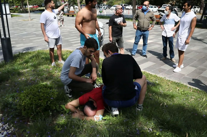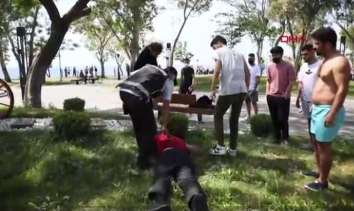 Sahil bölümünden kaçarak, otopark kısmına gelen şüpheli, kendisini yakalayan gençler tarafından yere yatırıldı.
