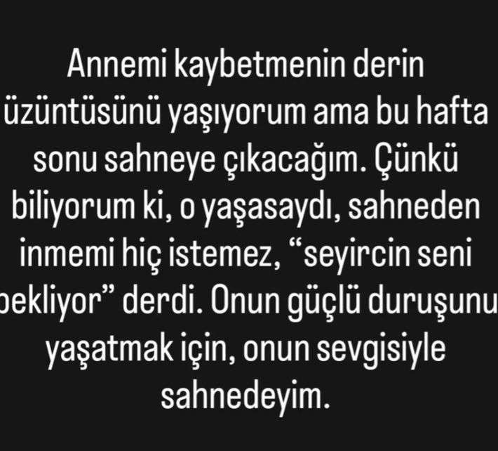 Şarkıcı, ardından yaptığı bir açıklama ile hafta sonu sahneye çıkacağını söyledi ve şu ifadeleri kullandı: Annemi kaybetmenin derin üzüntüsünü yaşıyorum ama bu hafta sonu sahneye çıkacağım. Çünkü biliyorum ki, o yaşasaydı, sahneden inmemi hiç istemez, "Seyircin seni bekliyor" derdi. Onun güçlü duruşunu yaşatmak için, onun sevgisiyle sahnedeyim.