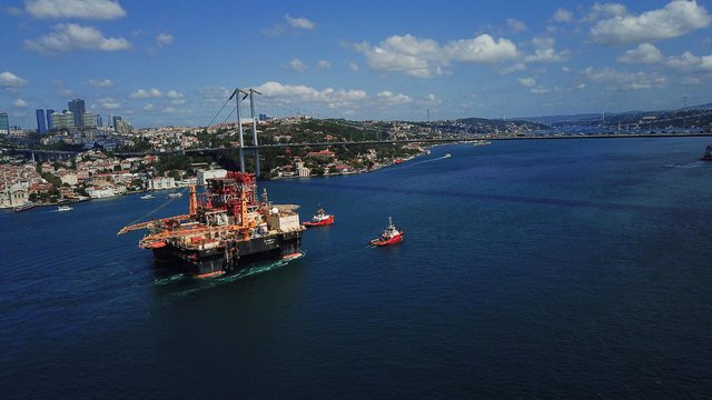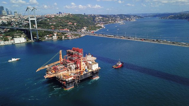 Bahama Adaları bayraklı, 115 metre boyunda ve 84 metre yüksekliğindeki dev petrol arama platformu, "Scarabeo 9" İstanbul Boğazı'ndan geçti.