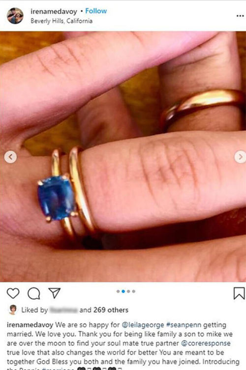 Medavoy, çiftin birbirlerine yüzük taktığı anı gösteren bir fotoğrafı, "Leila George ve Sean Penn evlendiği için çok mutluyuz. Sizi seviyoruz" notuyla sosyal medya hesabından takipçileriyle paylaştı.