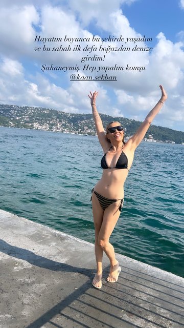 Ünlü oyuncu Şebnem Dönmez, İstanbul Boğazı'nın serin sullarına girdi. Dönmez; "İlk defa Boğaz'dan denize girdim"