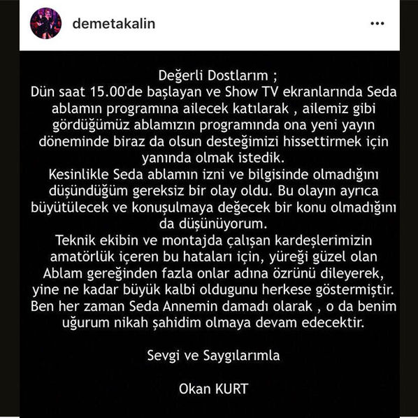 Büyük bir özür borcum var. Çok sevdiğim, nikah şahidi olduğum Okan Kurt'tan özür diliyorum. Ekibim adına özür diliyorum. Senden ve eşinden özür diliyorum. Ben senin ablanım. Sen de beni kırmadın programıma geldin. Benim haberimin olması mümkün değil... Sabaha kadar ağladım. İster kabul edin, ister etmeyin... Ben sizden kendim ve ekibim adına özür diliyorum. Okan hayatımda kaybetmeyi isteyeceğim son delikanlı. Umarım özrümü kabul ederler... Kimseyle küs kalmak istemiyorum.