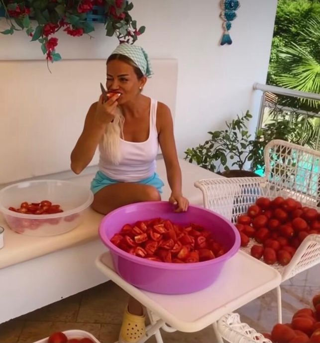 Domatesleri tek tek kesip robottan geçiren Üren'e çocukları ve eşi de yardım etti. Seda Üren, yaptığı paylaşımda şu ifadelere yer verdi: