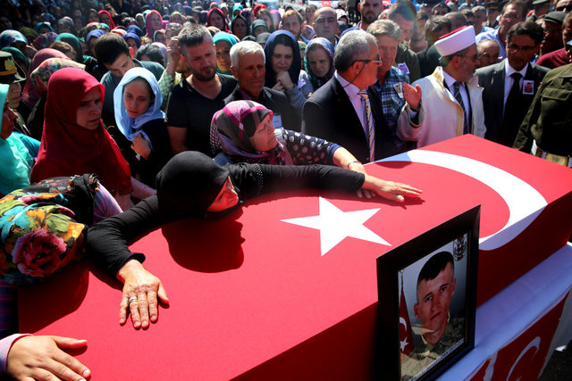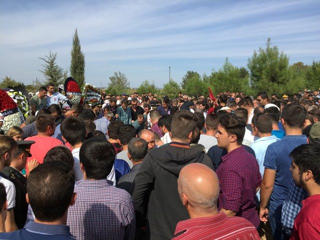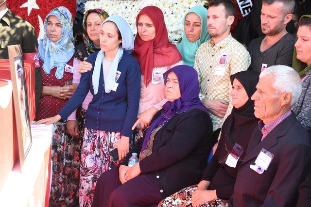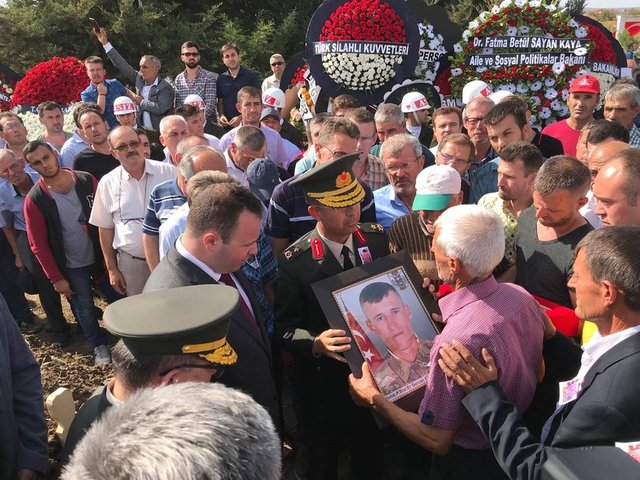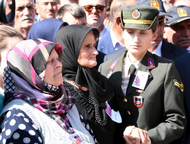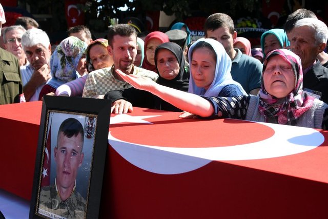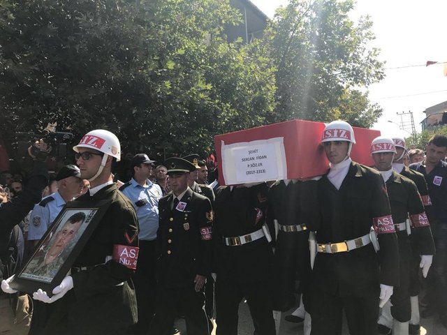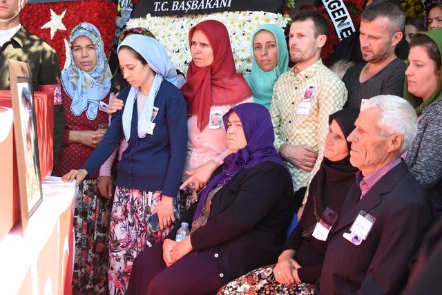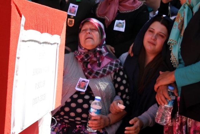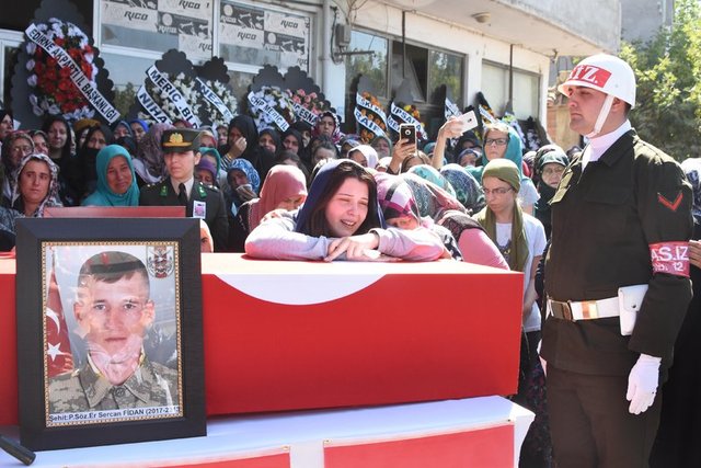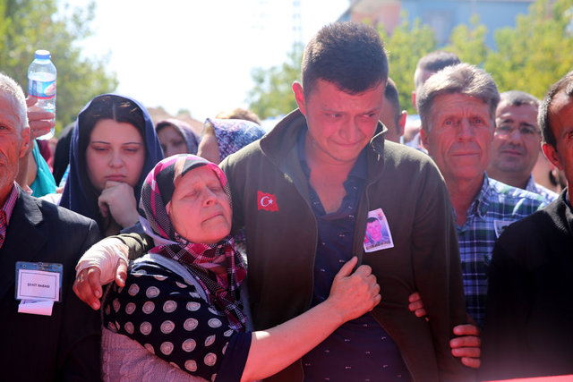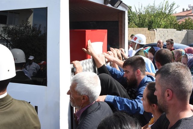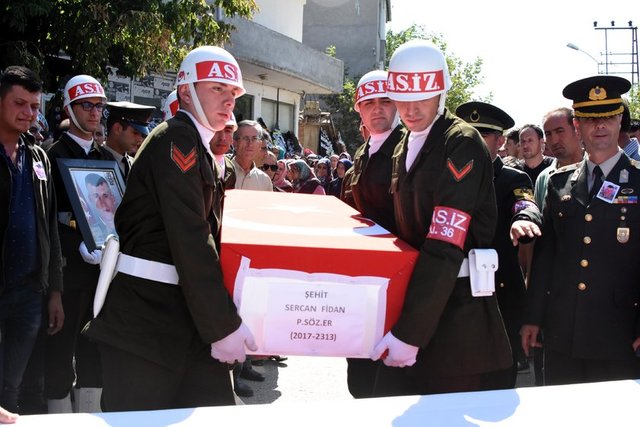 Şehit ailesi ve yakınları mezarlığa giden araçtaki tabuttan elini çekmedi. Şehit sözleşmeli er Sercan Fidan'ı son yolcuğuna 2 bin nüfuslu beldede dev Türk bayrağı açan yaklaşık 10 bin kişi uğurladı. Fidan, belde mezarlığında gözyaşları arasında toprağa verildi.