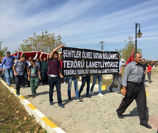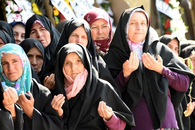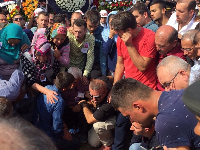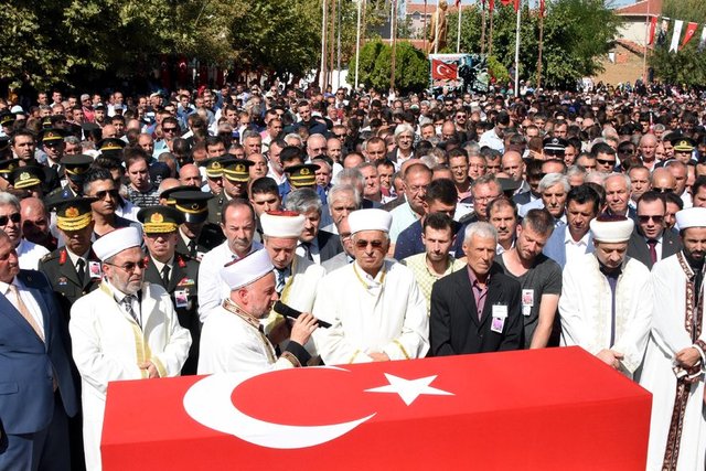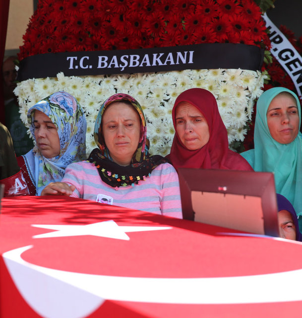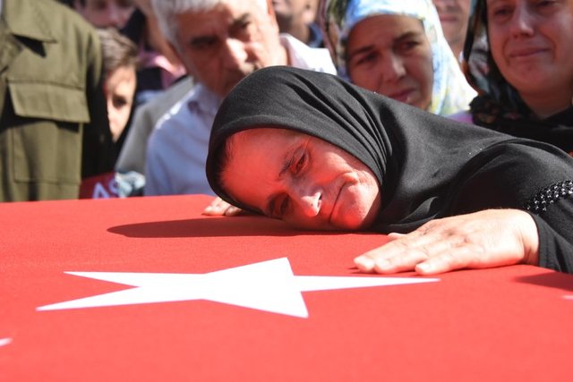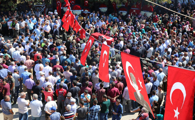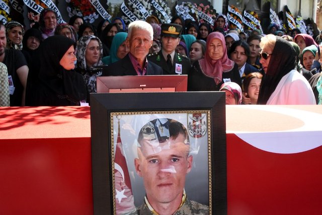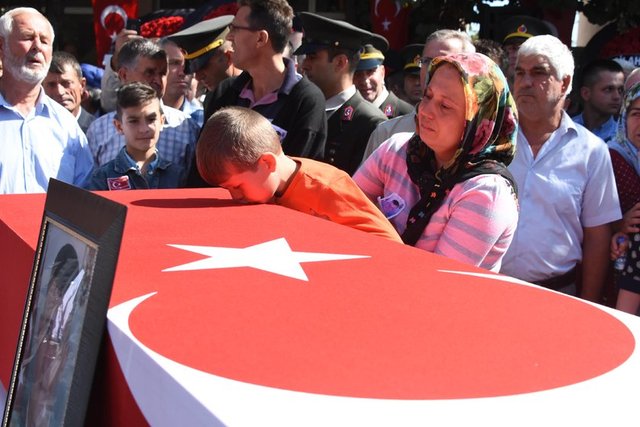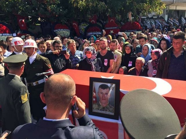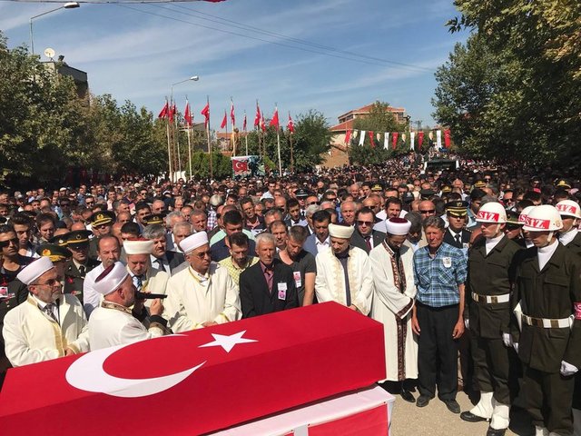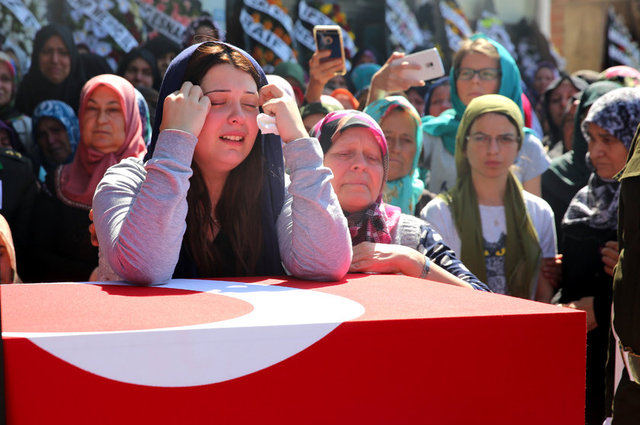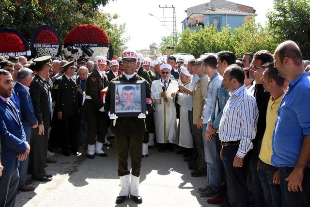Şehit ailesi ve yakınları mezarlığa giden araçtaki tabuttan elini çekmedi. Şehit sözleşmeli er Sercan Fidan'ı son yolcuğuna 2 bin nüfuslu beldede dev Türk bayrağı açan yaklaşık 10 bin kişi uğurladı. Fidan, belde mezarlığında gözyaşları arasında toprağa verildi.