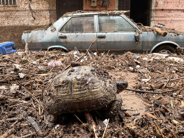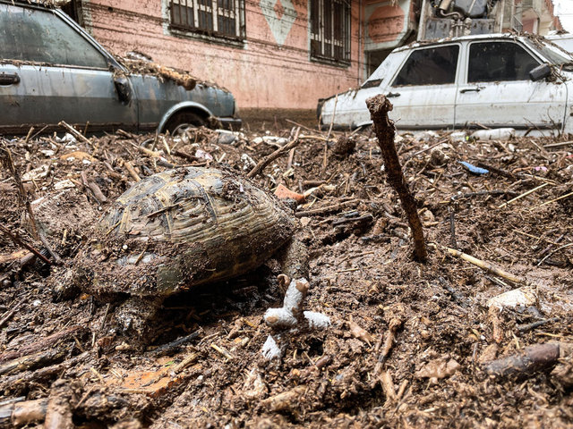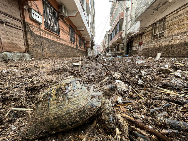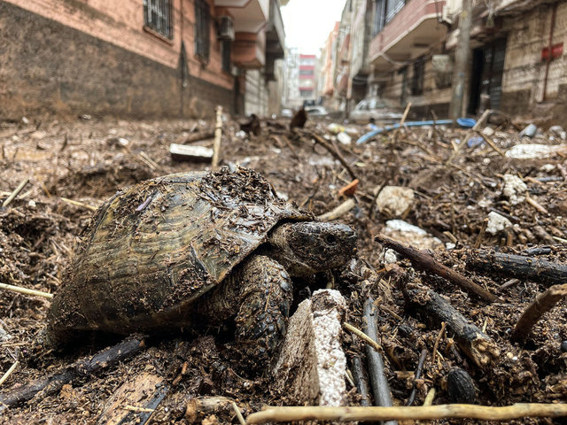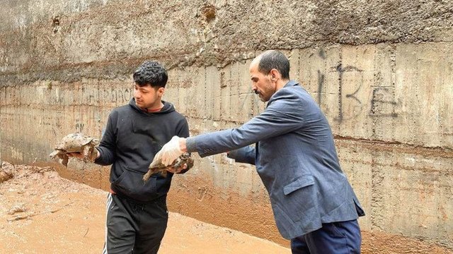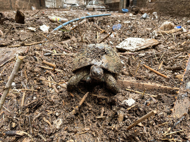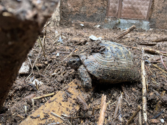 AA'nın haberine göre suların tamamen çekilmesiyle çamurla kaplanan Akabe Mahallesi 1436. Sokak'ta çalışmaları takip eden vatandaşlar, selde sürüklenen 2 kaplumbağa buldu.
