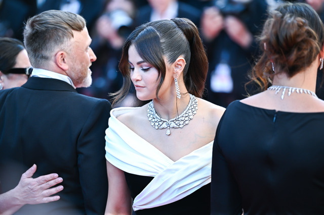Selena Gomez, omuzları açık beyaz yakalı elbisesini gösterişli bir pırlanta gerdanlık, çeşitli yüzükler ve küpeler de dahil olmak üzere takılarıyla tamamladı.