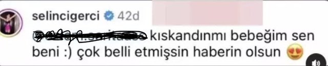 Yapılan yoruma Selin Ciğerci'den jet hızında cevap geldi. Ünlü fenomen yorumu: "Kıskandın mı bebeğim sen beni? Çok belli etmişsin haberin olsun." şeklinde yanıtladı.