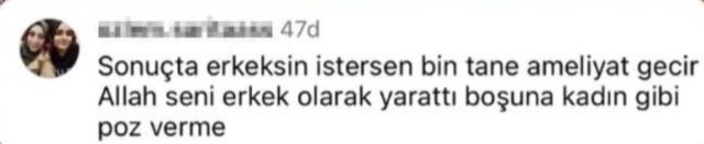 Fenomen ismin paylaşımının altına bir sosyal medya kullanıcısı tarafından: "Sonuçta erkeksin. İstersen bin tane ameliyat geçir Allah seni erkek olarak yarattı. Boşuna kadın gibi poz verme." şeklinde bir yorum geldi.