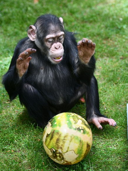 Hayvanat bahçesinin yeşil alanlarında gönlünce oynayan şempanze, bakıcıyla yerlerde yuvarlanıp keyifli vakit geçirirken, top oynayıp yürüyüş de yaptı.