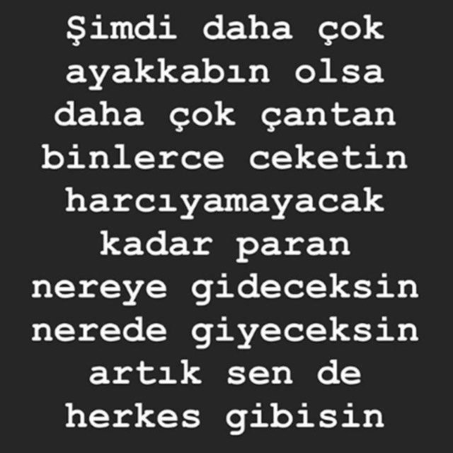 Şimdi daha çok ayakkabın olsa, daha çok çantan, binlerce ceketin, harcayamayacak kadar paran... Nereye gideceksin? Nerede giyeceksin? Artık sen de herkes gibisin.