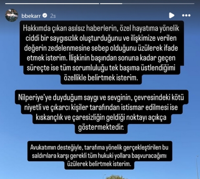 Baturalp Bekar, söz konusu iddianın büyük yankı uyandırmasının ardından açıklama yaptı. Bekar, "Hakkımda çıkan asılsız haberlerin, özel hayatıma yönelik ciddi bir saygısızlık oluşturduğunu ve ilişkimize verilen değerin zedelenmesine sebep olduğunu üzülerek ifade etmek isterim. İlişkinin başından sonuna kadar geçen süreçte ise tüm sorumluluğu tek başıma üstlendiğimi özellikle belirtmek isterim. Nilperi'ye duyduğum saygı ve sevginin, çevresindeki kötü niyetli ve çıkarcı kişiler tarafından istismar edilmesi ise kıskançlık ve çaresizliğin geldiği noktayı açıkça göstermektedir. Avukatımın desteğiyle, tarafıma yönelik gerçekleştirilen bu saldırılara karşı gerekli tüm hukuki yollara başvuracağımı üzülerek belirtmek isterim" dedi.
