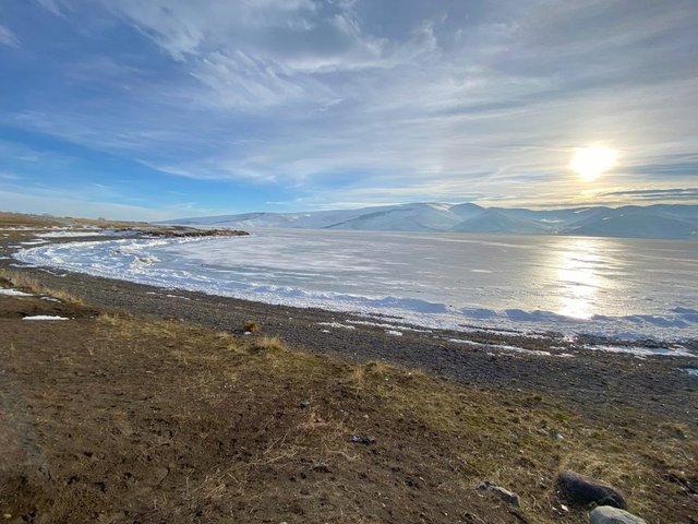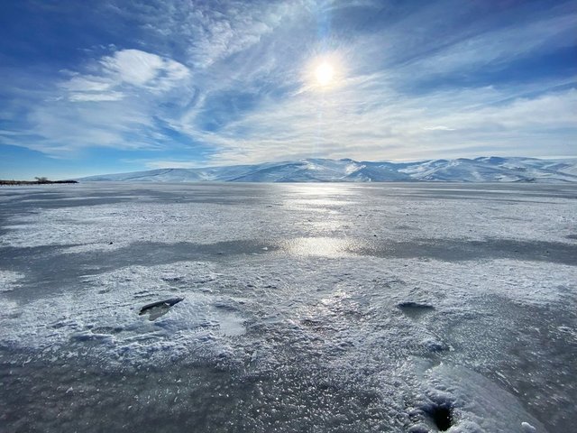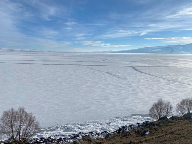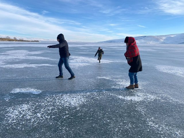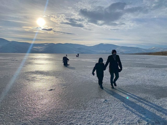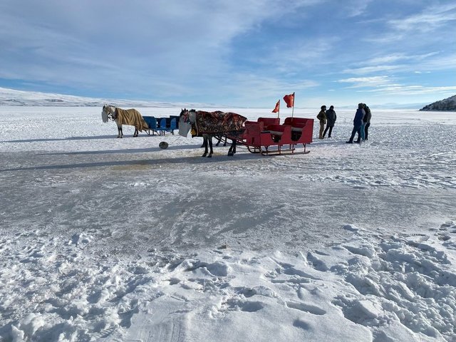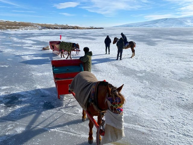 Çıldır Gölünün kalın buz tabakasını fırsat bilenler atlı kızakla gezinti yaptı, buz üzerinde yürüyüş keyfini çıkardı.