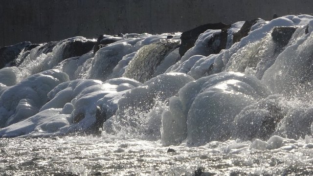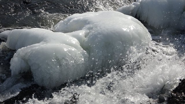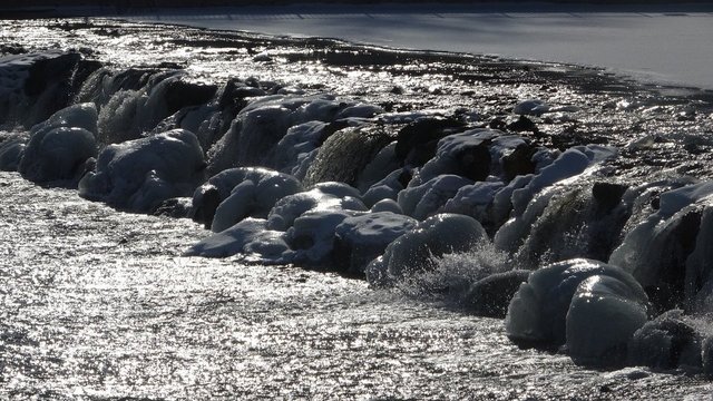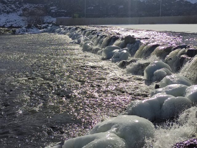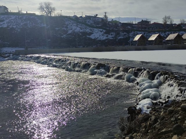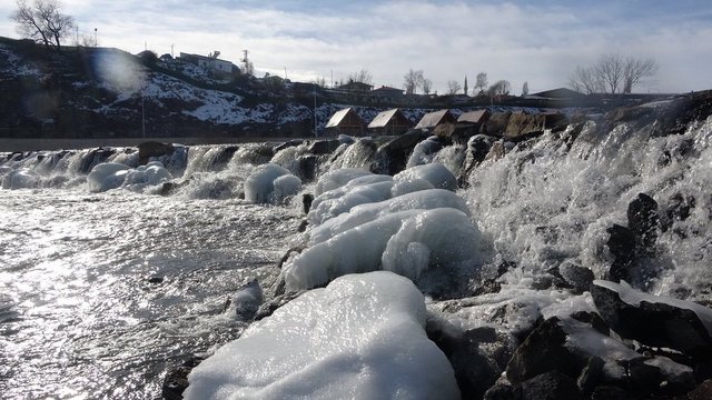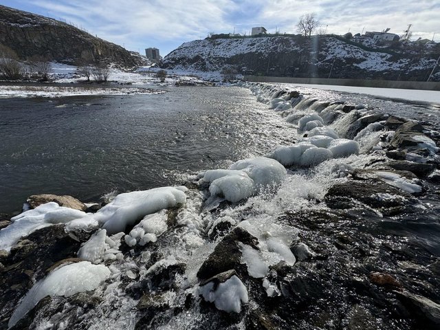 Nehrin Bungalovlar mevkisinde su akışının altında kalan kayalar buzla kaplandı.
