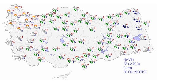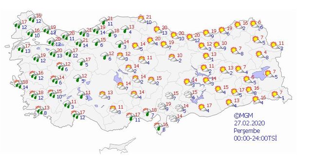 Perşembe günü yurdun batısında Marmara, Ege ve Akdeniz'de sağanak beklenirken, diğer bölgelerde parçalı bulutlu bir hava olması tahmin ediliyor. Cuma günü ise sıcaklıkların mevsim normallerinde seyredeceği tahmin ediliyor. İstanbul'da 13, Ankara'da 10 ve İzmir'de 16 derece sıcaklık bekleniyor.