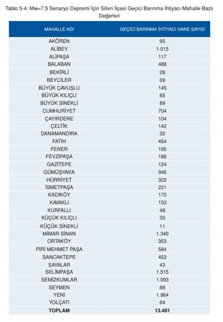 *Senaryo depremi için Silivri ilçesi mahalle bazlı "geçici barınma" değerleri