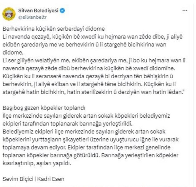Silvan Belediyesi, sokak köpeklerinin toplandığını duyurdu: Tepkiler üzerine paylaşım silindi