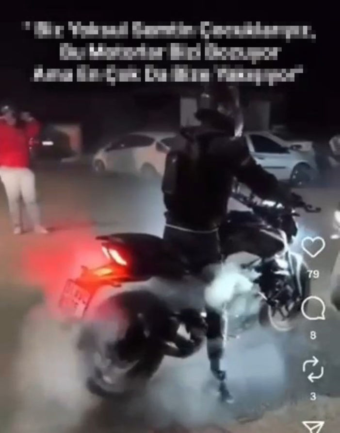 Paylaştığı görüntülerde; aşırı hız yaptığı, lastik yaktığı ve makas attığı görülen sürücünün M.E.K. olduğu belirlendi. Ekiplerin takibi sonucu yakalanan M.E.K.'ye toplam 19 bin 217 lira idari para cezası kesildi. Ayrıca trafiği tehlikeye düşürme suçundan da adli işlem başlatıldı.