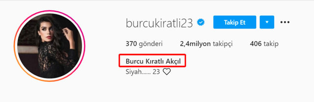 2 milyondan fazla takipçisi bulunan ünlü oyuncu, Instagram'da soyadını "Burcu Kıratlı Akçıl" olarak güncelledi.