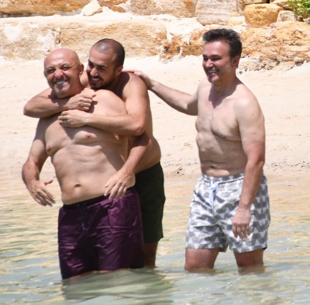 Yaz aylarını Çeşme'de kendi evlerinde geçiren Engin ile Aksakallı, dostları Şentürk'ü kumsalda ağırladı. Uzun süre localarında sohbet eden dörtlü, ilerleyen saatlerde birlikte denize girdi.