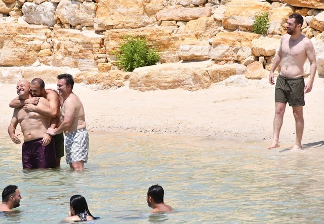 Soluğu Çeşme'de alan Sinan Engin, Oğulcan Engin, Mustafa Aksakallı ve Erhan Şentürk, plajda gülme krizine girdi. Dörtlünün keyifli halleri objektiflere yansıdı