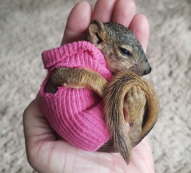 Çoraptan yapılan kazakla ısınan minik bir sincap kalpleri fethediyor.