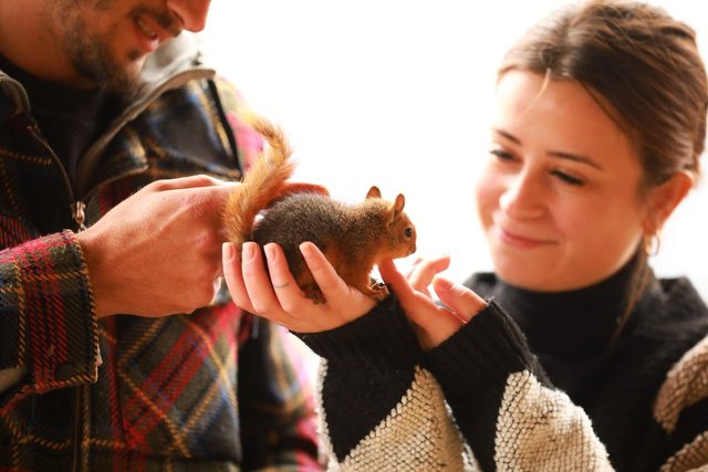 Kocaeli'nin Başiskele ilçesine bağlı Yuvacık mevkisinde bulunan işletme sahipleri Enes ve Minel Kılıç çifti, ağaç kovuğunda yavru sincap buldu.