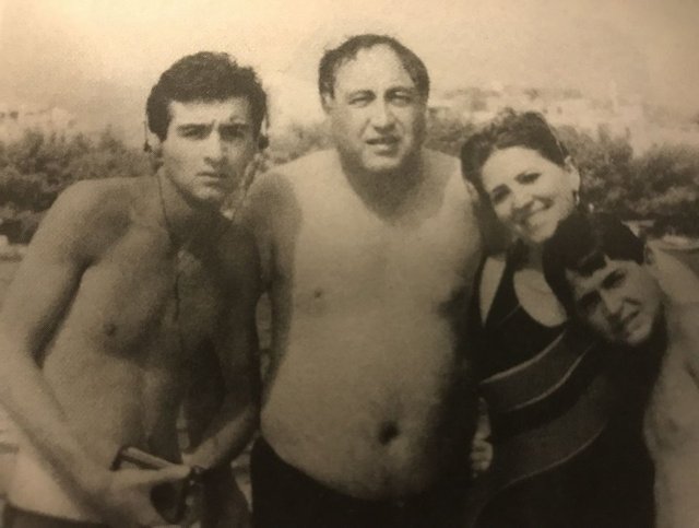 Yılmaz Erdoğan, Nazım Erdoğan, Süleyha Erdoğan ve Deniz Erdoğan Erdek Zeytinliada'da. Yılmaz Erdoğan, dönemin fenomen aygıtlarından walkmen ile poz vermiş. (1986)