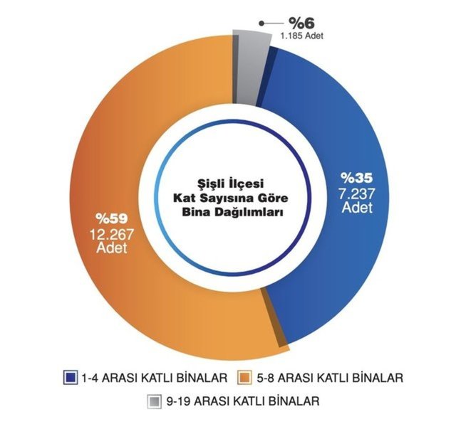 Şişli ilçesi kat sayısına göre bina dağılımları şu şekildedir; 1-4 kat arası binalar 7.237 adet (%35), 5-8 kat arası binalar 12.267 adet (%59), 9-19 kat arası binalar 1.185 adet (%6).