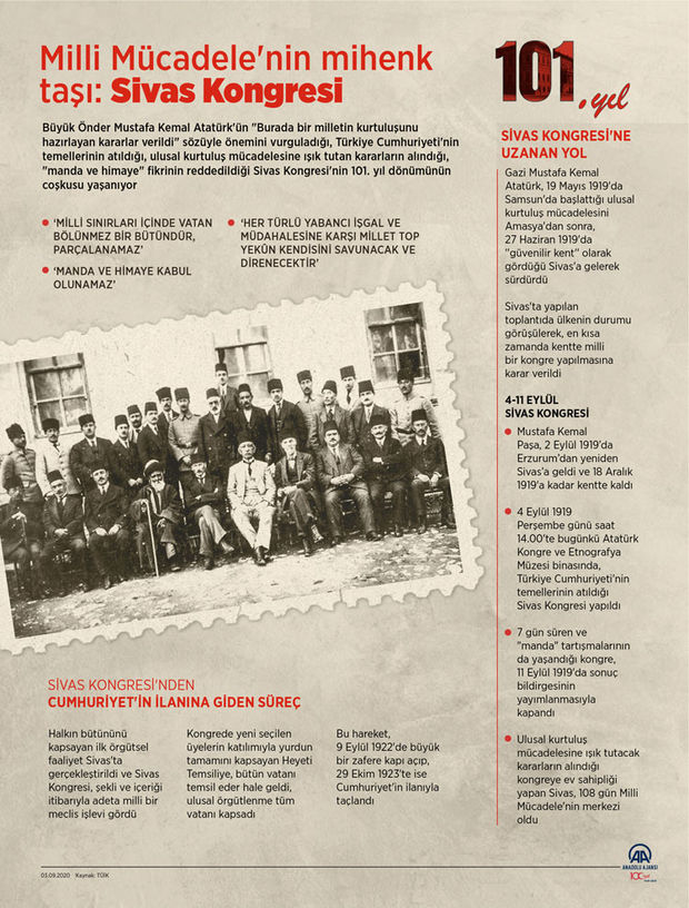 Büyük Önder Mustafa Kemal Atatürk ve silah arkadaşları tarafından 4 Eylül 1919'da gerçekleştirilen Sivas Kongresi'ne ev sahipliği yapan, "manda ve himaye" fikrinin reddedilerek ulusal bağımsızlık düşüncesinin benimsendiği, ulusal kurtuluş mücadelesine ışık tutacak kararların alındığı ve 108 gün Milli Mücadele'nin merkezi olan Sivas'ta, tarihi kongrenin 101. yıl dönümü dolayısıyla bazı etkinlikler gerçekleştirilecek.