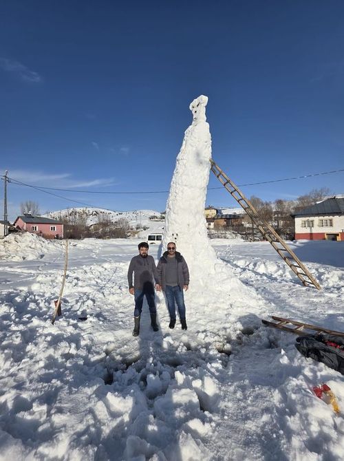 Sivas'ın Yıldızeli ilçesine bağlı Geynik köyünde, yoğun kar yağışının ardından çocuklar ve vatandaşlar bir günde yaklaşık 8 metrelik kardan adam yaptı, kardan adam daha çok kuleyi andırdı