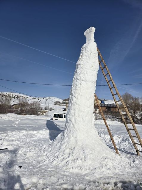 Köyde yaşayan Yakup Aydın, çocukları ve arkadaşlarının da desteğiyle, iskele kullanarak sadece bir gün içerisinde yaklaşık 8 metre yüksekliğinde dev bir kardan adam yaptı.