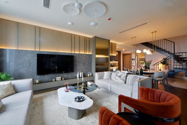 Sezonun trend renk ve malzemelerinin tercih edildiği projede, klasik nötr tonlar, taş ve ahşap dokularıyla dengeleniyor. Tüm mekanlarda fonksiyonlara özel kimliklerin yaratılmasına önem verilen projede, ev sakinleri için farklı yerleşim fikirleri ve çözüm önerileri sunuluyor. Salona bağlanan ve yüksek tavanı ile öne çıkan teras, aile için alternatif bir yaşam alanı sunarken, aynı zamanda ev sahiplerinin hobi alanı olarak değerlendirebilecekleri bir mekana dönüşüyor.