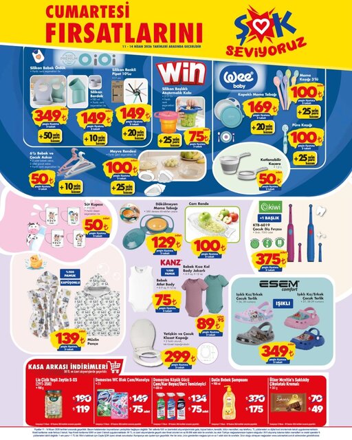 ŞOK marketin 11 Nisan aktüel kataloğu belli oldu. Bu hafta ŞOK marketin Cumartesi fırsatlarında çocuk terliği, panço, bebek ve çocuk askısı, kapaklı mama tabağı, mama kaşığı, katlanabilir koçero, meyve rendesi, dökülmeyen mama tabağı, silikon bebek önlüğü, silikon bardak, midilli at, saat ve blok, pelüş tırtıl, pelüş dinozor, plastik motosiklet, puzzle, rakamlı yer karosu, hikaye kitabı, bebek şampuanı gibi çeşitli ürünler raflarda yerini alacak. İşte ŞOK 11 Nisan 2026 Cumartesi fırsatları aktüel broşürü haberimizde...