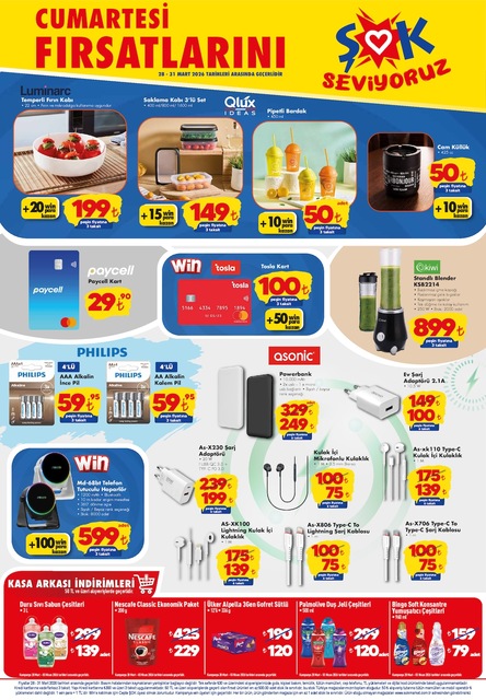 ŞOK marketin 28 Mart aktüel kataloğu yayınlandı. Bu Cumartesi günü ŞOK marketlerde manyetik yapı blokları, fanuslu blok çiçek, şehir başlangıç setleri, kutu oyun çeşitleri, puzzle, altını ıslatan bebek, fırın kabı, pipetli bardak, cam küllük, standlı blender, powerbank, telefon tutuculu hoparlör, şarj adaptörü, sıvı sabur çeşitleri, kulak için mikrofonlu kulaklık gibi birçok ürün satışta olacak. İşte ŞOK 28 Mart 2026 Cumartesi Fırsatları aktüel broşürü haberimizde...