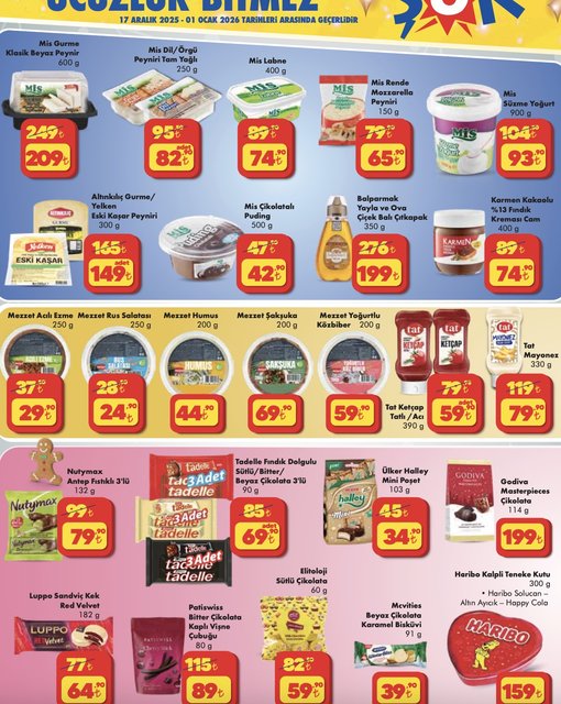 ŞOK 17 Aralık 2025 Çarşamba aktüel ürünler kataloğunu duyurdu. İndirimli ürünlerin sınırlı olduğu markette bu hafta yılbaşı temalı ürünler dikkat çekiyor. ŞOK aktüel kataloğunda Gold Yumurta Standlı Tatlı Kaşık Çatal Seti 399 TL , Şeker Kamışı Figürlü Tabak 249 TL , Cam Çerezlik 50 TL , Figürlü Kupa 219 TL , Figürlü Sıvı Sabunluk 199 TL'den satışa çıkıyor. İşte, 17 Aralık 2025-1 Ocak 2026 ŞOK aktüel ürünler kataloğu indirimli listenin tamamı