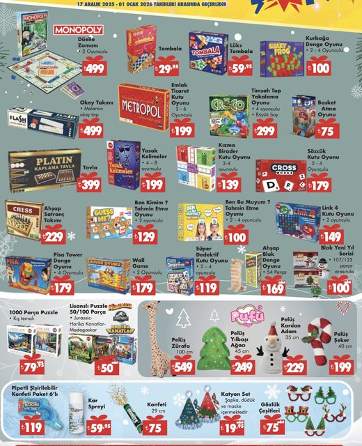 ŞOK aktüel ürünler kataloğu indirimleri belli oldu. 17 Aralık-1 Ocak tarihleri arasında geçerli olacak ŞOK indirimlerinde monopoly, tombala, okey takımı, satranç takımı, tavla yer alıyor. Öte yandan yılbaşı temalı ürünler dikkat çekiyor. Peki, ŞOK aktüel ürünler kataloğunun tamamında neler var?