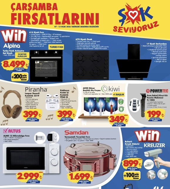 ŞOK aktüel ürünler kataloğu yayınlandı. ŞOK 7-13 Ocak tarihleri arasında Alpina turbo fanlı ankastre set siyah 8,499 TL, Piranha leopar desenli kulaklık 399 TL, Piranha kablosuz kulak içi kulaklık 399 TL, Kiwi döner başlıklı diş fırçası 349 TL’den satışa çıkacak. İşte, ŞOK indirimli ürünler kataloğu