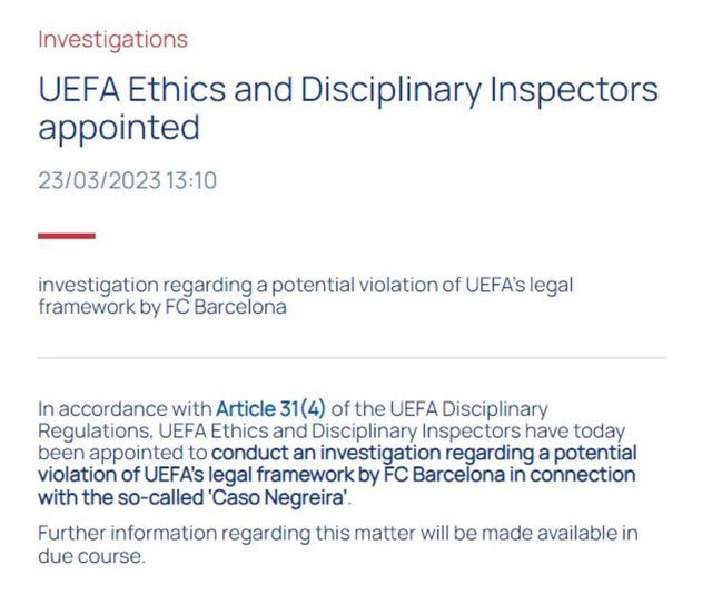 Açıklamada, "UEFA Disiplin Yönetmeliği'nin 31. maddesi uyarınca, UEFA Etik ve Disiplin Müfettişleri, Barcelona'nın 'Caso Negreira' (Negreira Davası) olarak adlandırılan olayla bağlantılı yasal çerçeveyi ihlal etme ihtimaline ilişkin bir soruşturma yürütmek üzere görevlendirilmiştir." denildi.