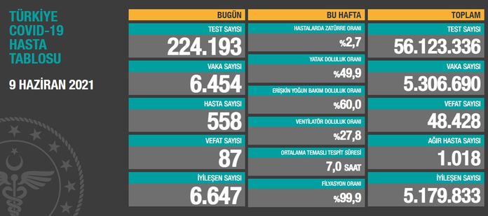 Test sayısı 56 milyon 123 bin 336'ya ulaştı, vaka sayısı 5 milyon 306 bin 690, vefat sayısı ise 48 bin 428 oldu.