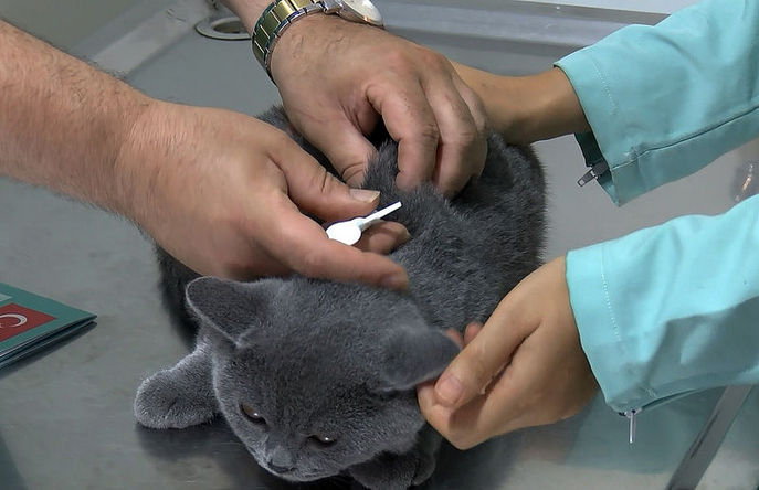 CEVAP: Kedi, köpek ve gelinciklere içinde 15 karakterli kod numarası bulunan mikroçip, hayvanın iki kürek kemiği arasına veya sol tarafta boynun kulağa yakın kısmına deri altına enjektör vasıtasıyla uygulanmaktadır.