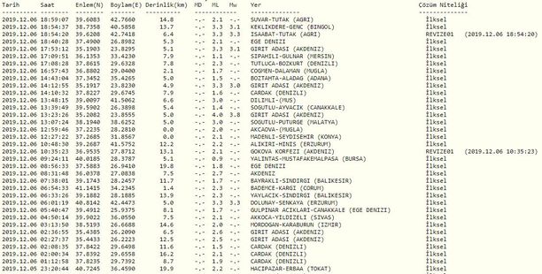 Boğaziçi Üniversitesi Kandilli Rasathanesi ve Deprem Araştırma Enstitüsü (KRDAE) Bölgesel Deprem-Tsunami İzleme ve Değerlendirme Merkezi (BDTİM) verilerine göre Türkiye ve çevresinde meydana gelen son depremler şöyle: