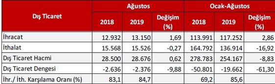 2019 yılının ilk 8 ayında ihracat yüzde 2.9 artış gösterdi, ithalat ise yüzde 16.9 azaldı. 8 ayda ihracatın ithalatı karşılama oranı geçen sene 69.2 iken bu sene yüzde 85.6'ya çıktı.