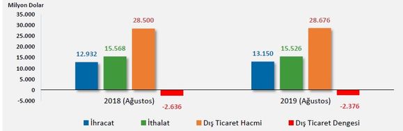 Ağustos ayında ihracat 13 milyar 150 milyon dolar, ithalat 15 milyar 526 milyon dolar oldu. Dış ticaret açığı ağustosta geçen yılın aynı ayına göre yüzde 9.88 azalarak 2 milyar 376 milyon dolara indi. İhracatın ithalatı karşılama oranı yüzde 84.7 oldu.