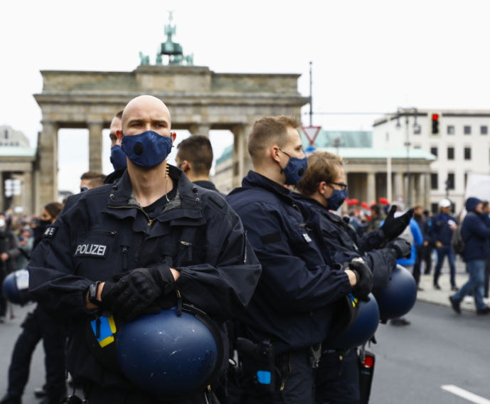 Federal Mecliste görüşülen ve salgınla mücadelede hükümetin daha hızlı hareket etmesini sağlayacak Enfeksiyon Koruma Yasası'nın sertleştirilmesi için hazırlanan tasarıyı protesto etmek amacıyla binlerce kişi Meclis binasının yakınındaki Brandendenburg Kapısı’nın önünde toplandı.