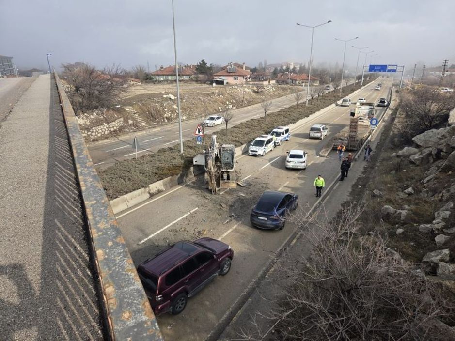 Ankara'nın Elmadağ ilçesinde, bir TIR'ın üzerinde bulunan kepçe, köprü altından geçiş sırasında köprüye takılarak yola düştü ve facia kıl payı atlatıldı.