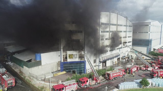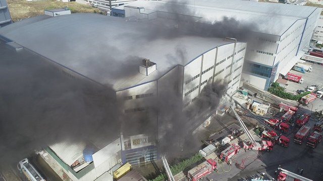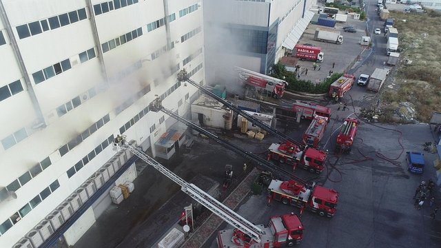 Yangının devam ettiği fabrika havadan da görüntülendi.