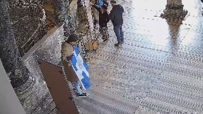 Ayasofya-i Kebir Cami-i Şerifi'nde dini ve ideolojik içerik taşıyan sembolik bayrak açan yabancı uyruklu 2 kişi tutuklandı.
