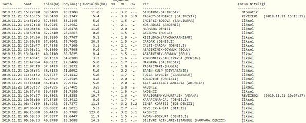 Boğaziçi Üniversitesi Kandilli Rasathanesi ve Deprem Araştırma Enstitüsü (KRDAE) Bölgesel Deprem-Tsunami İzleme ve Değerlendirme Merkezi (BDTİM) verilerine göre, Türkiye ve çevresinde meydana gelen son depremler şöyle: