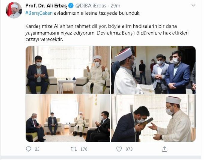 Diyanet İşleri Başkanı Prof. Dr. Ali Erbaş, Ankara'da ezan okunduğu esnada yüksek sesle müzik dinledikleri için arkadaşıyla uyardığı 3 kişi tarafından bıçaklanarak öldürülen Barış Çakan'ın ailesine taziye ziyaretinde bulundu. Baba Nihat Çakan’a taziyelerini ileten Diyanet İşleri Başkanı Erbaş, “Gencimize Allah rahmet eylesin, mekanı cennet olsun inşallah. Sizlere de sabırlar ihsan eylesin” dedi.